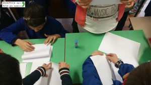Nell’aula laboratorio i bambini e le bambine sono entrati in silenzio, non sapendo cosa aspettarsi. Quando hanno visto gli uccelli sospesi si sono guardati con aria interrogativa. All’inizio sono rimasti al di fuori dell’area installazione. Poi un temerario ha varcato il confine e sono entrati tutti. Prima timidamente, poi con entusiasmo si sono mossi tra gli uccelli, li hanno toccati, sfiorato le nuvole, giocato insieme. Finita la musica e la loro esplorazione li abbiamo invitati a sedere ed è partita la narrazione. Ci siamo alternate io e Annamaria nella lettura, a conclusione della quale abbiamo creato un po’ di dibattito e introdotto l’ultima parte del laboratorio: l’attività manuale.